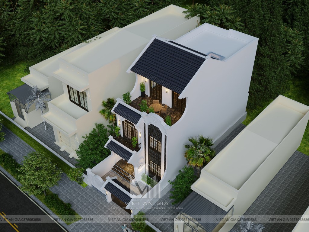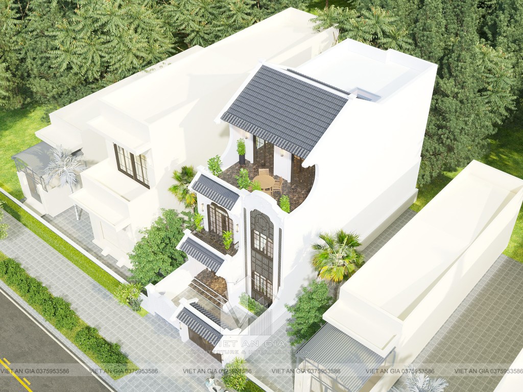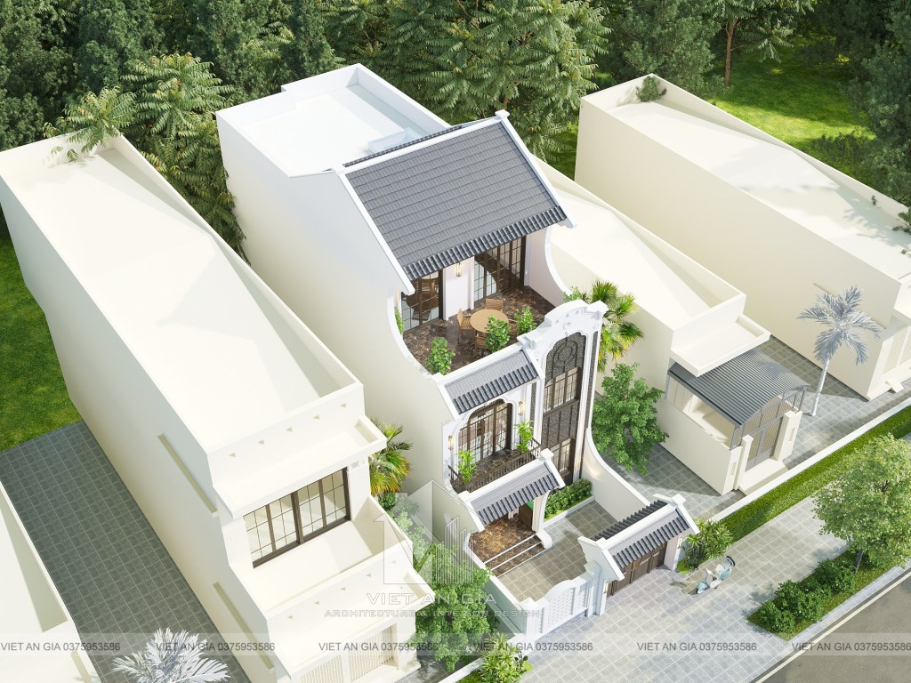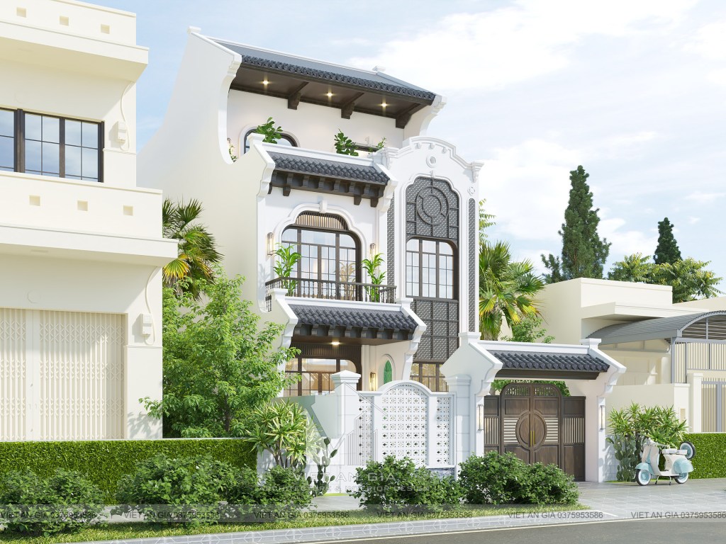 Mẫu nhà 3 tầng này được thiết kế với phong cách Indochina đặc trưng, sử dụng tông màu trắng chủ đạo kết hợp với mái ngói xám đậm, tạo cảm giác thanh lịch và hoài cổ. Các cửa vòm cong mềm mại, ban công với lan can sắt uốn hoa văn, và các chi tiết trang trí tinh xảo mang đậm dấu ấn kiến trúc Đông Dương. Mái ngói cong nhẹ và các ô thoáng trên tường không chỉ tăng tính thẩm mỹ mà còn giúp ngôi nhà luôn thoáng mát, phù hợp với khí hậu Việt Nam.