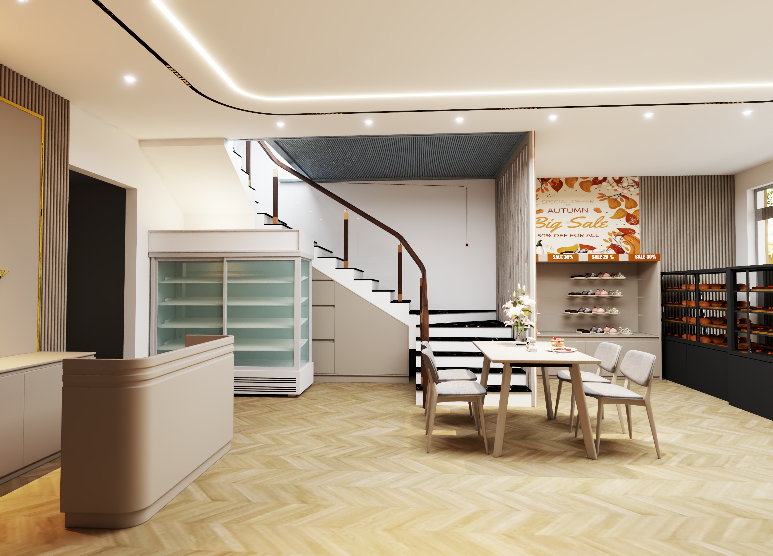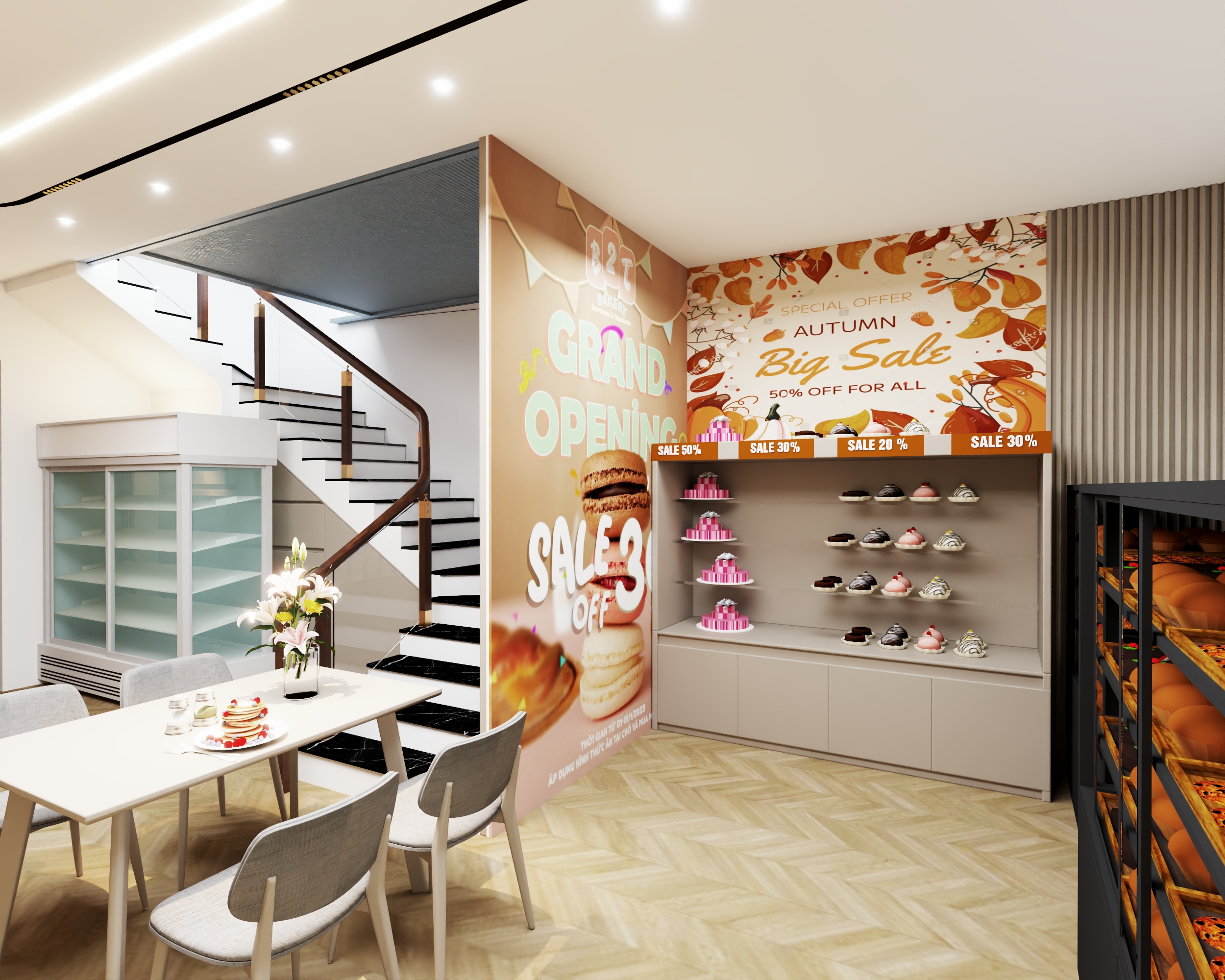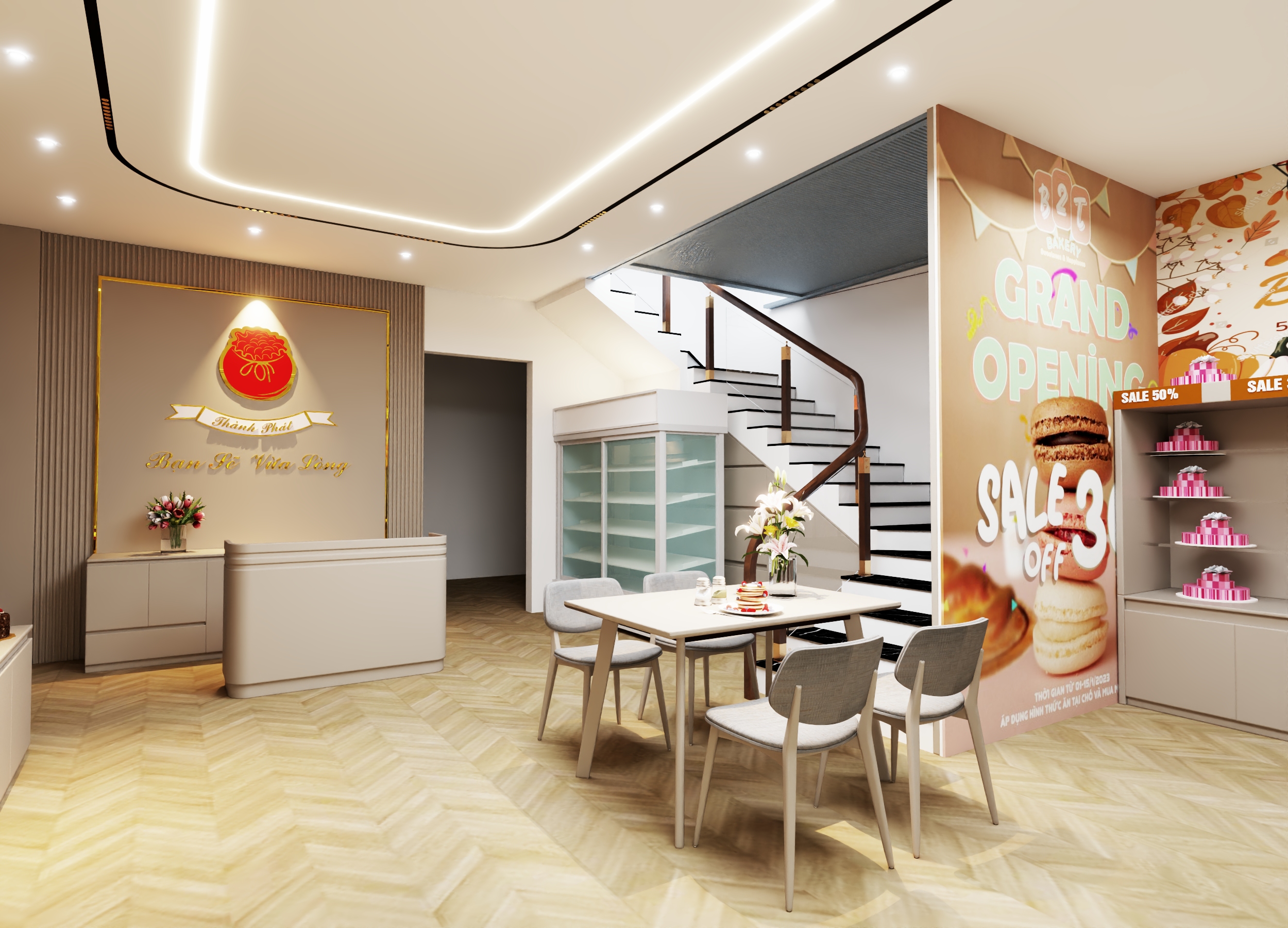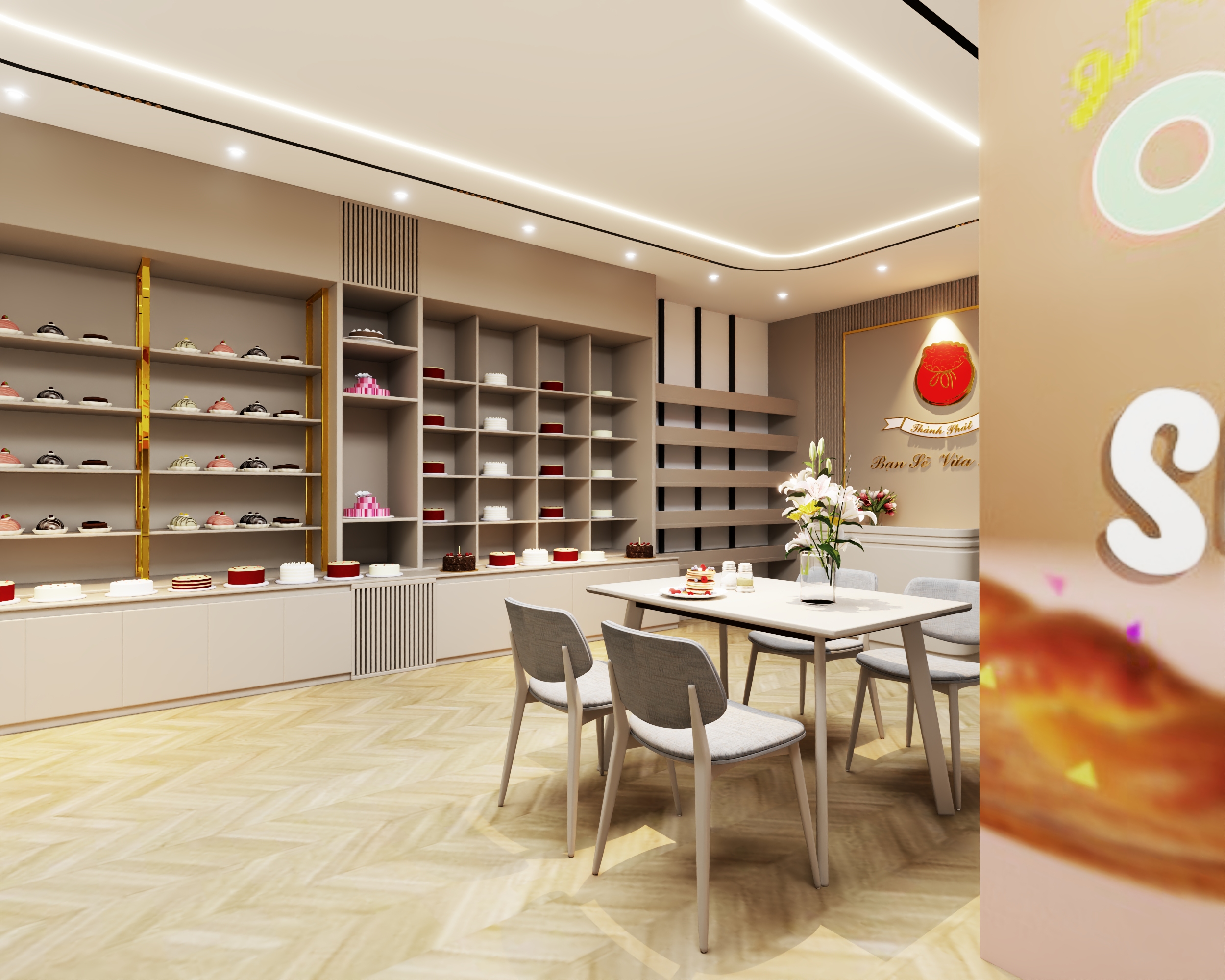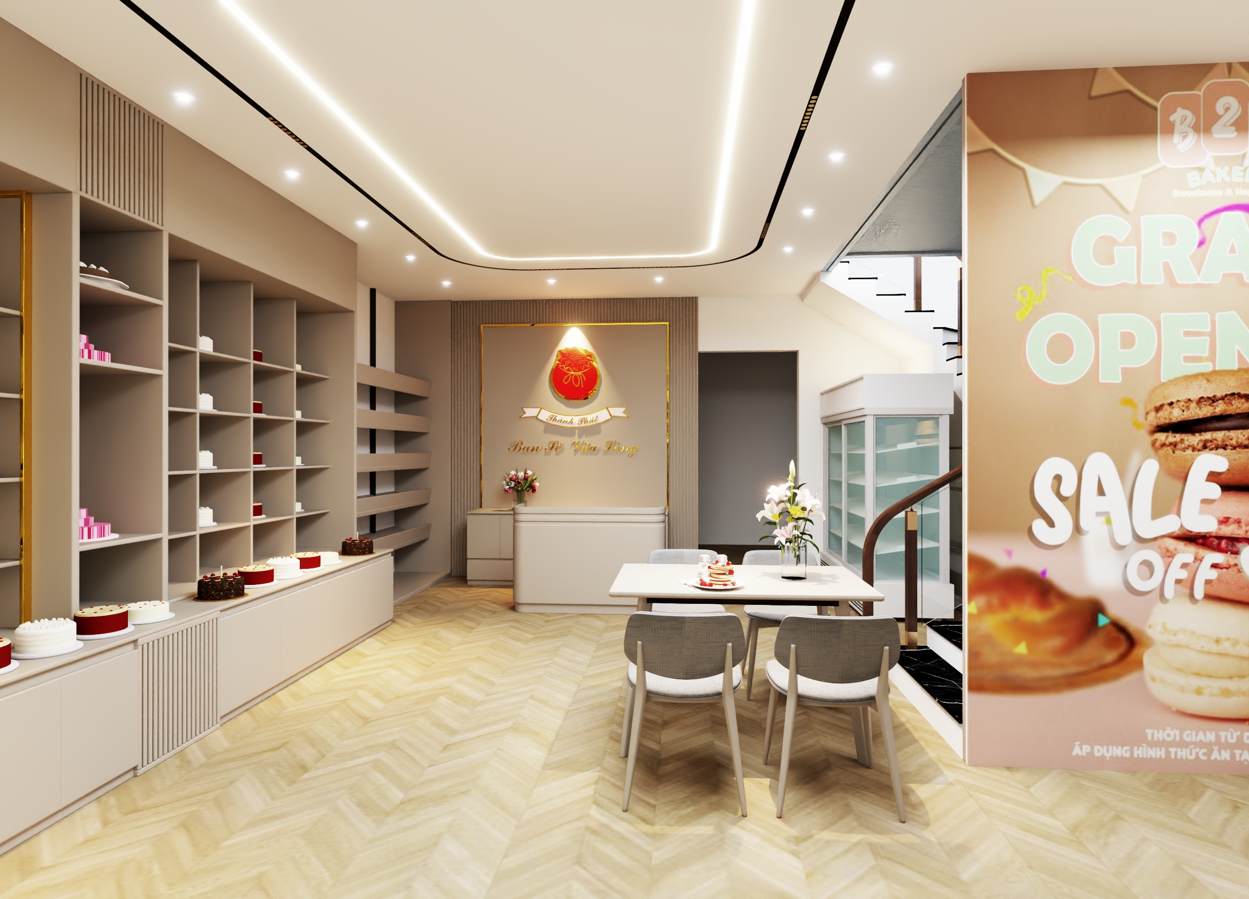 Về phong thủy, không gian tiệm bánh được thiết kế với bố cục thông thoáng, đón ánh sáng tự nhiên, tạo luồng sinh khí dồi dào, mang lại năng lượng tích cực cho khách hàng. Một số chi tiết như cây xanh nhỏ hoặc bể nước mini được bố trí khéo léo, tượng trưng cho yếu tố Thủy, giúp thu hút tài lộc và may mắn cho việc kinh doanh.