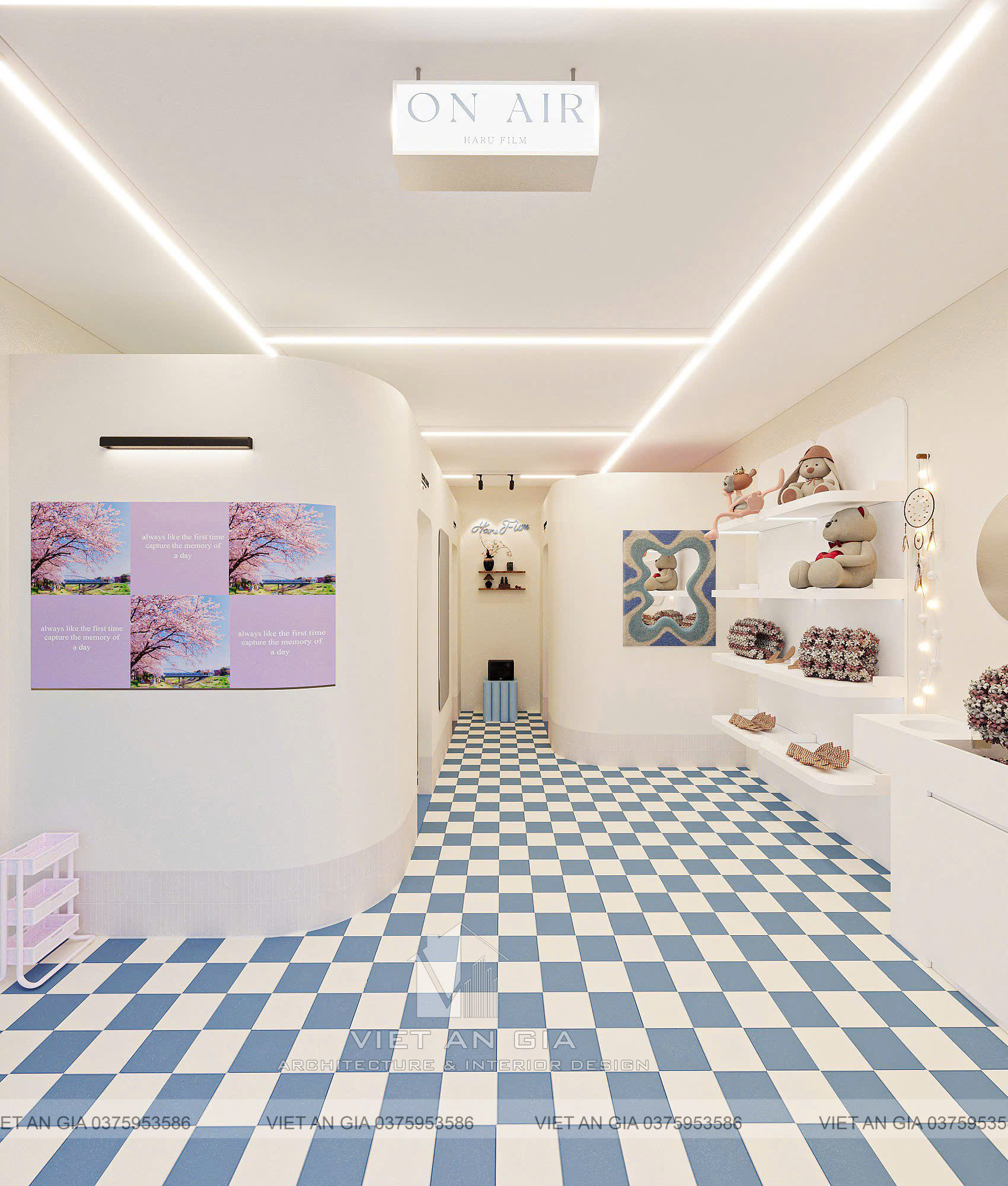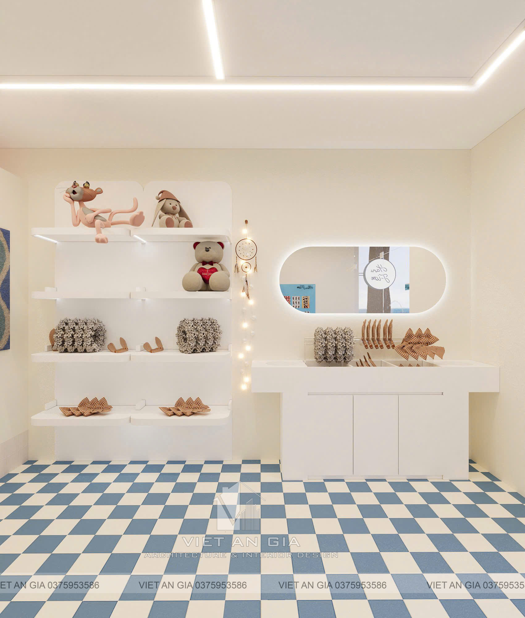 Điểm nhấn độc đáo là sàn nhà họa tiết caro xanh trắng, tạo sự tương phản thú vị và nét vui tươi cho tổng thể. Hệ thống kệ trưng bày bo tròn mềm mại không chỉ an toàn cho trẻ nhỏ mà còn giúp làm nổi bật các sản phẩm phụ kiện, gấu bông xinh xắn. Tủ kệ và quầy được thiết kế đơn giản, đồng bộ màu sắc, tối ưu công năng sử dụng.