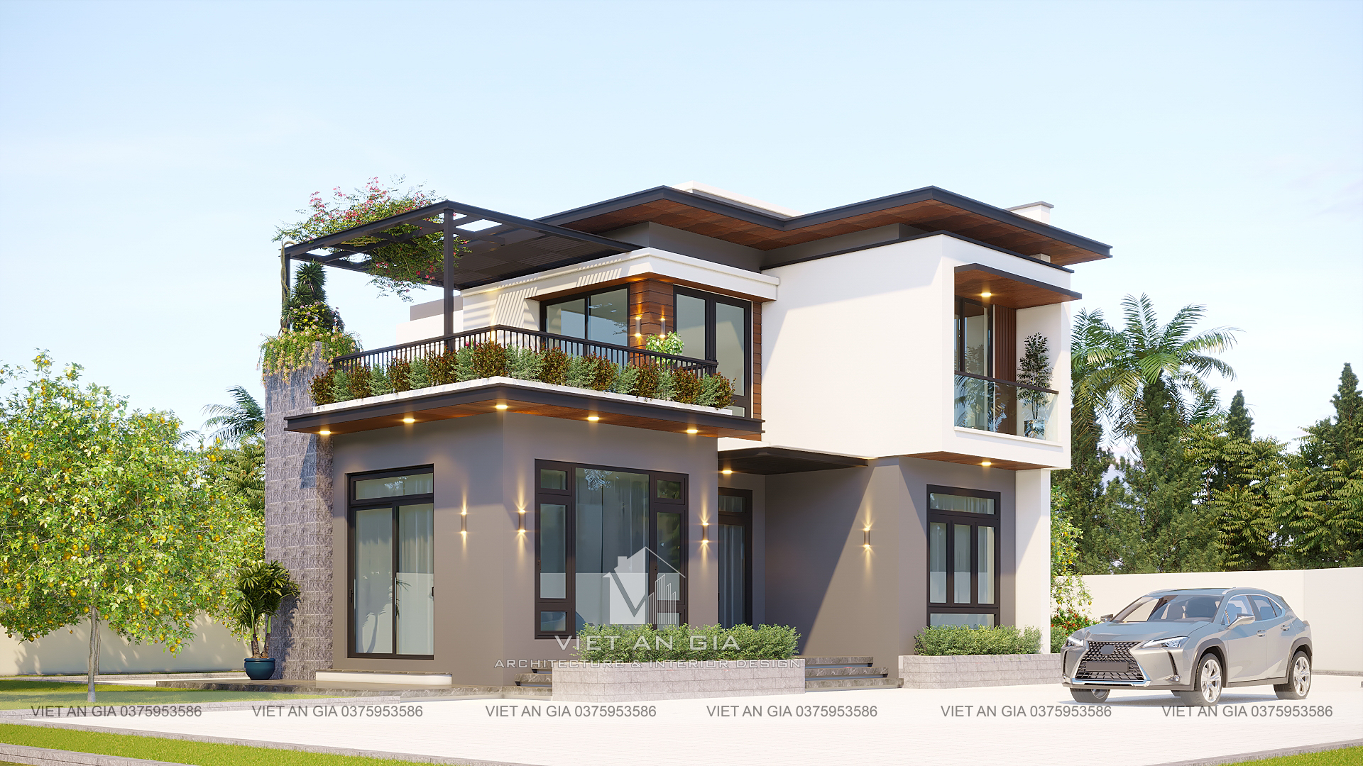 Mặt tiền của căn nhà được thiết kế với phong cách tối giản nhưng không kém phần sang trọng, sử dụng tông màu trắng và xám làm chủ đạo, kết hợp cùng các mảng ốp gỗ nâu ấm áp, tạo cảm giác hiện đại và gần gũi. Tầng 1 nổi bật với cửa kính lớn, cho phép ánh sáng tự nhiên tràn ngập không gian bên trong, đồng thời mang lại cảm giác thoáng đãng. Tầng 2 được thiết kế với ban công rộng, có lan can kính trong suốt và giàn pergola phủ cây xanh, vừa tạo bóng mát vừa mang lại không gian thư giãn ngoài trời lý tưởng. Khu vực sân trước được bố trí với các bồn cây xanh và thảm cỏ, tạo cảm giác tươi mới và gần gũi với thiên nhiên.