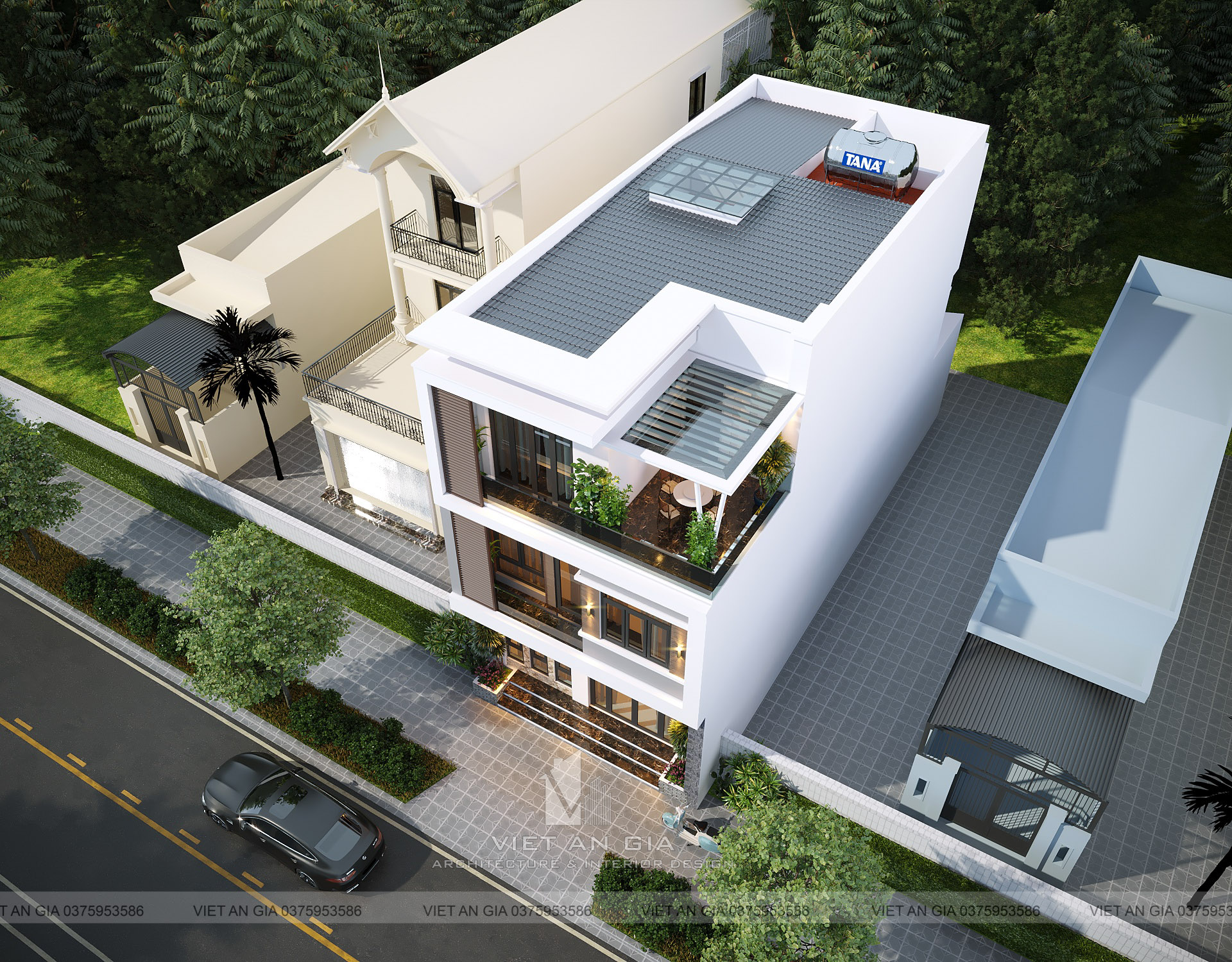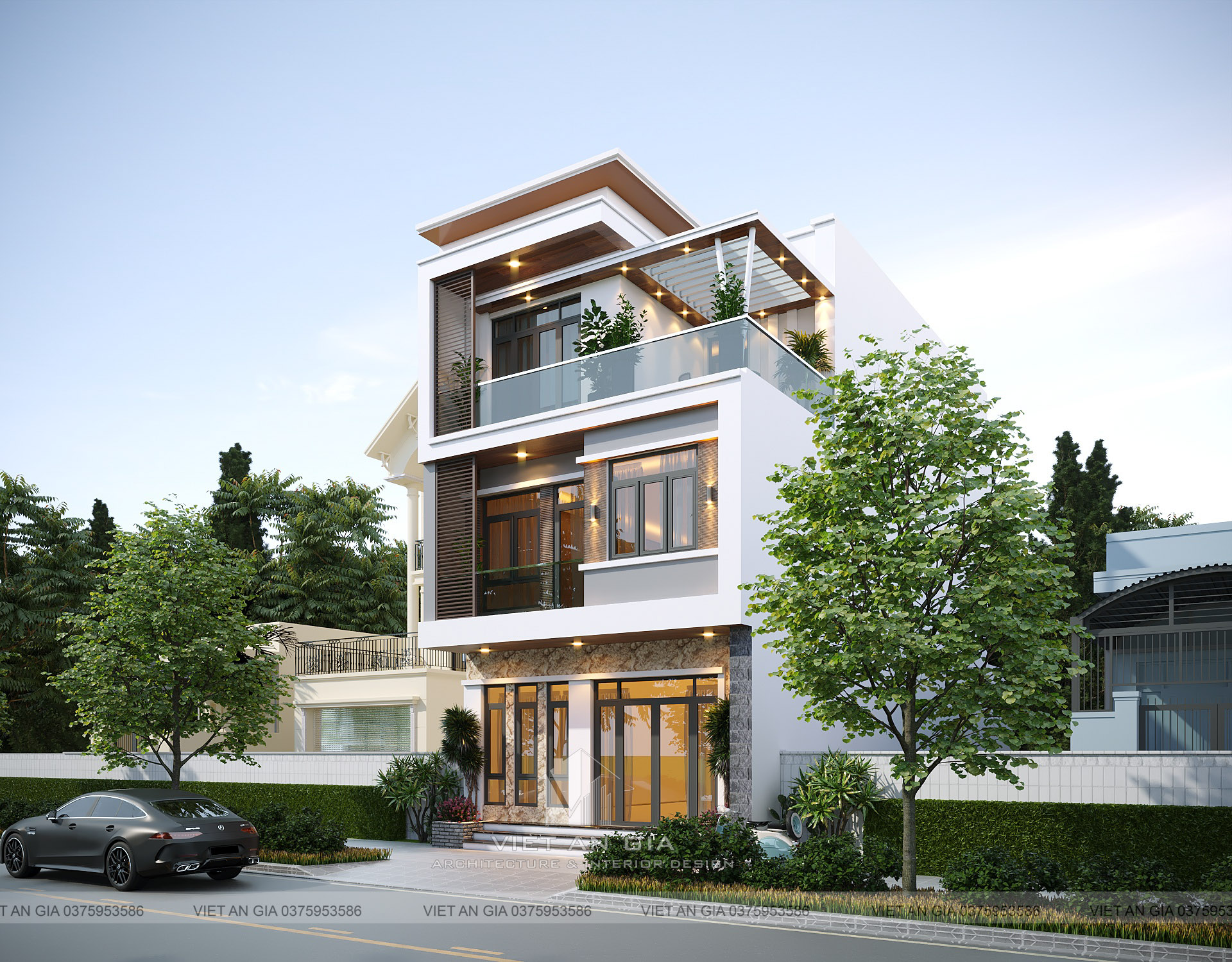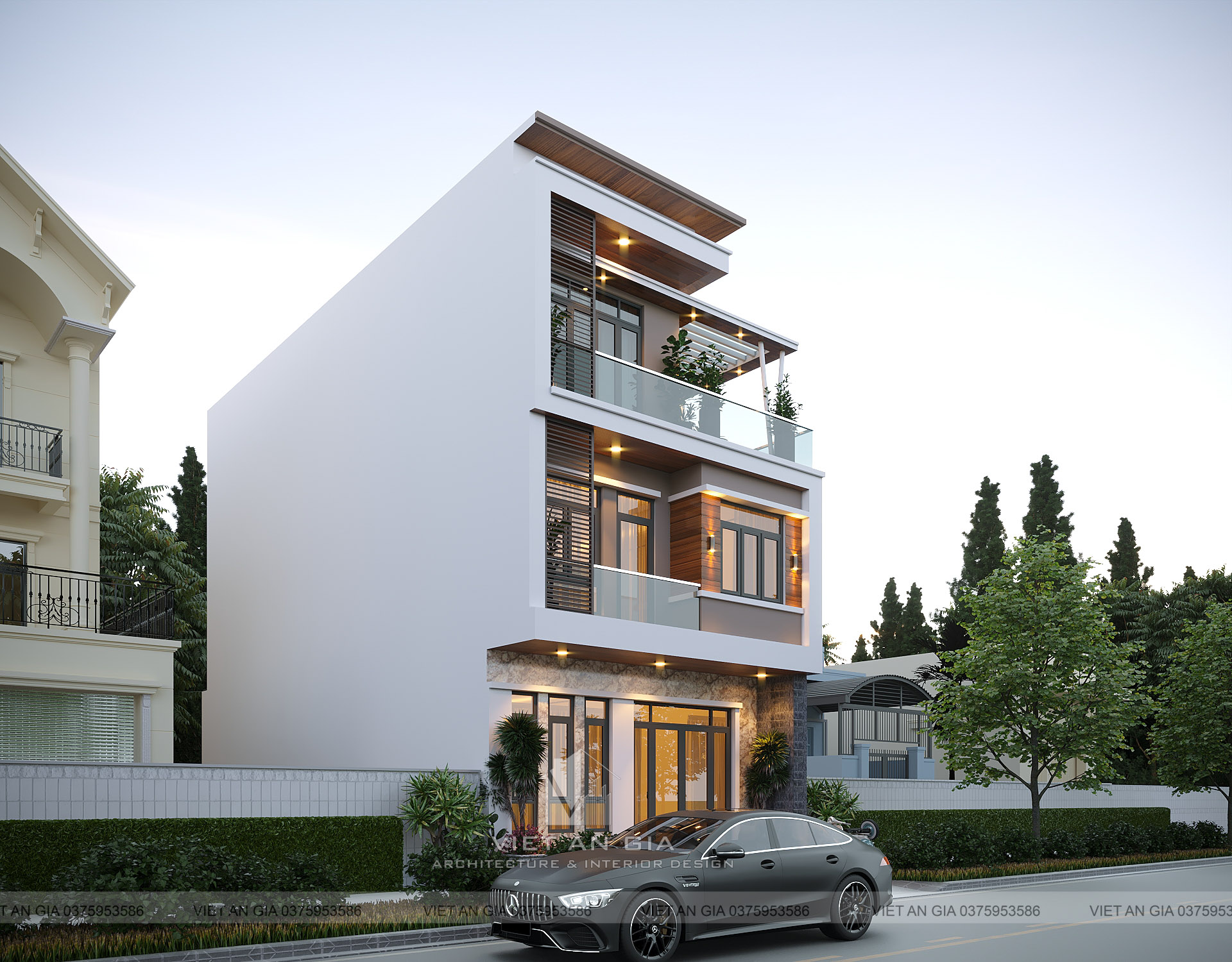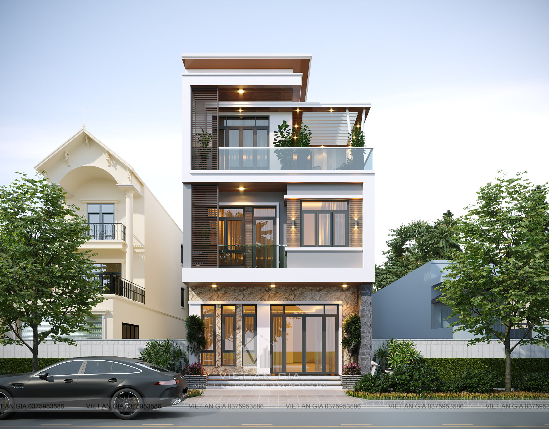 Hệ thống cửa kính lớn và ban công rộng mở ở mỗi tầng không chỉ giúp lấy sáng tối đa mà còn tạo không gian thư giãn lý tưởng. Đây là sự lựa chọn hoàn hảo cho những gia chủ yêu thích vẻ đẹp hiện đại, tiện nghi và đẳng cấp.